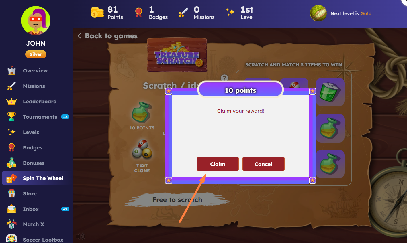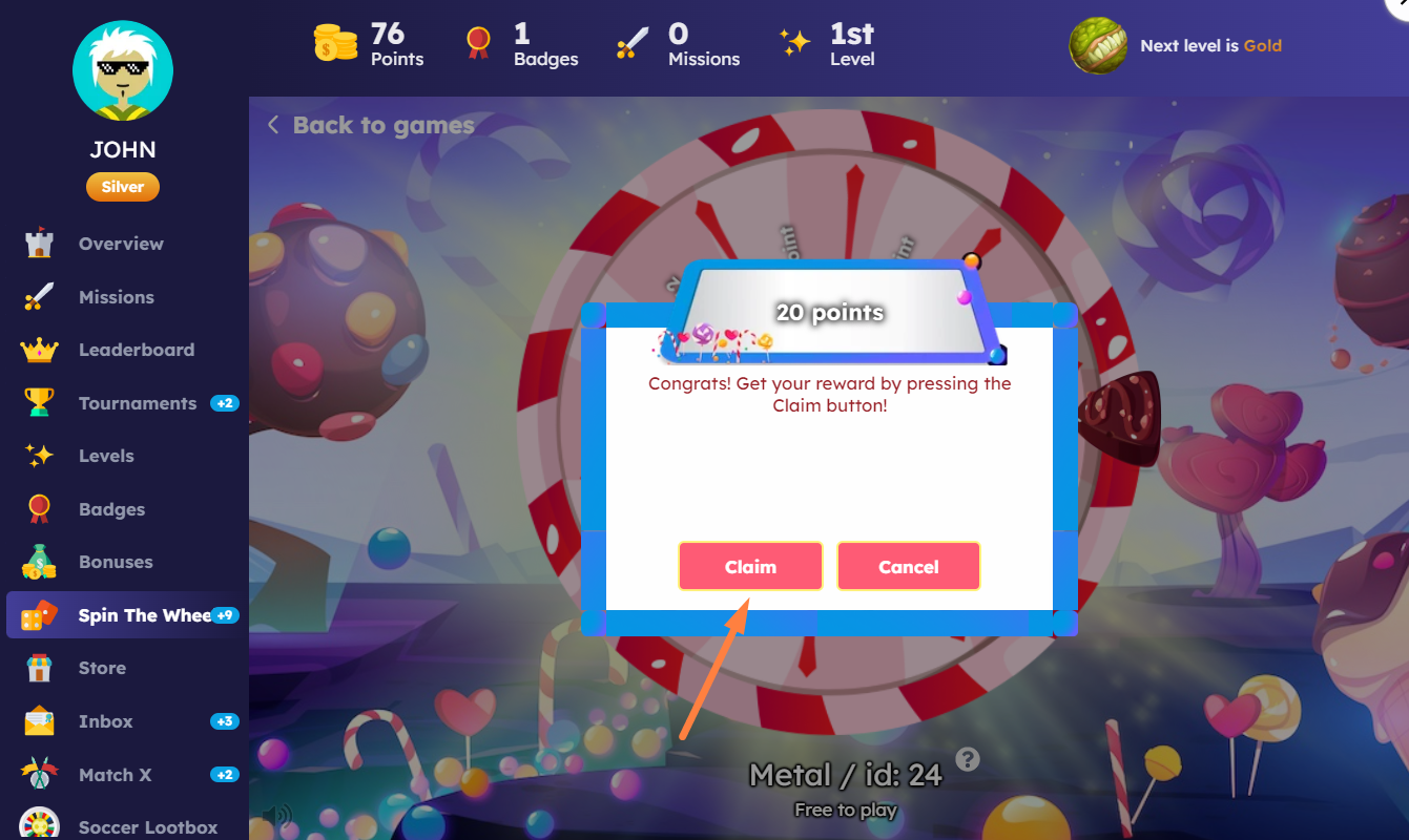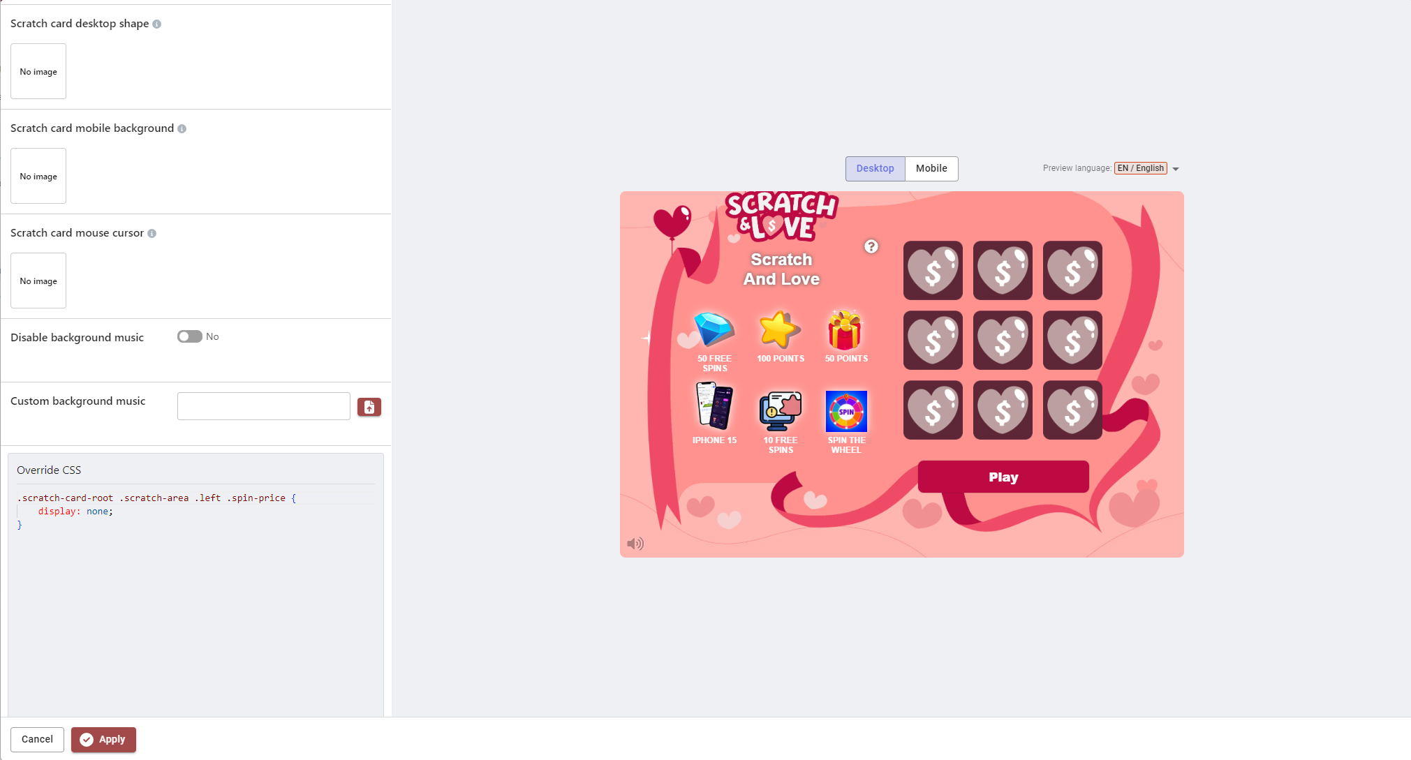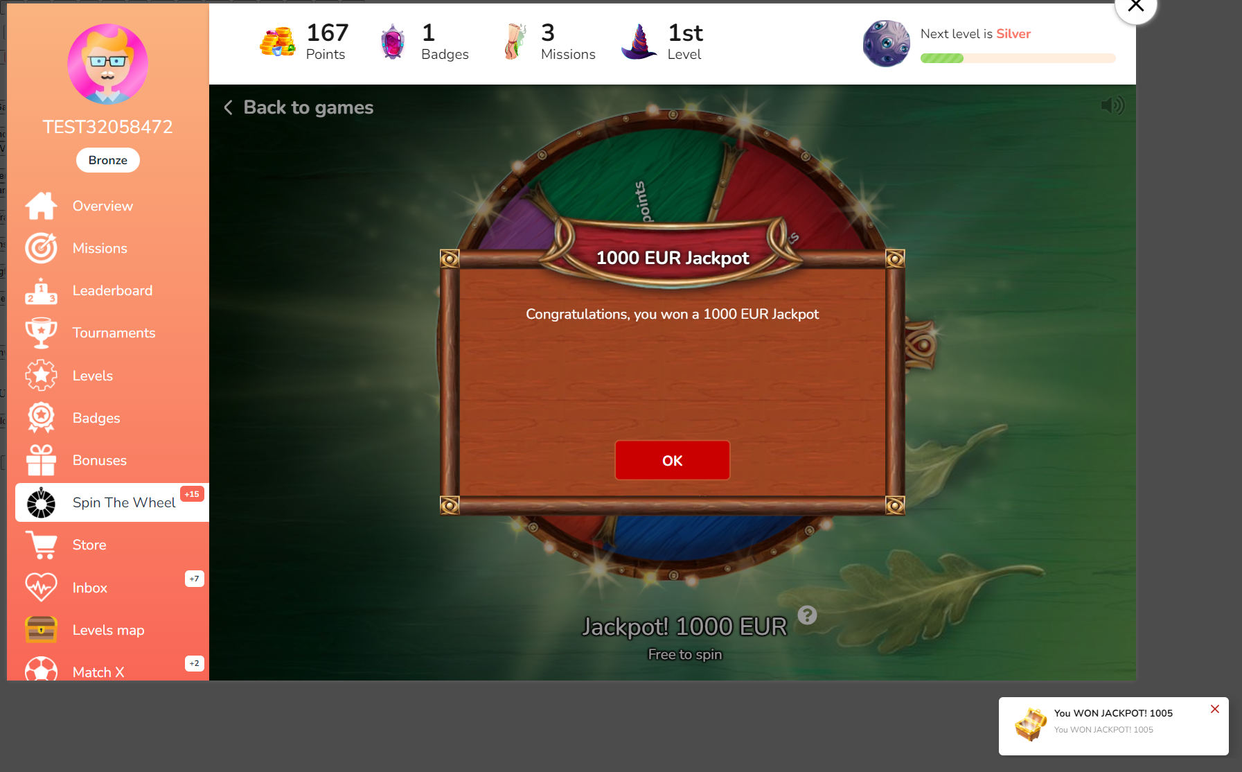 * Prize type - Points, No Prize, Bonus template, Tangible, Spin attempt (in the same or another game), Jackpot
