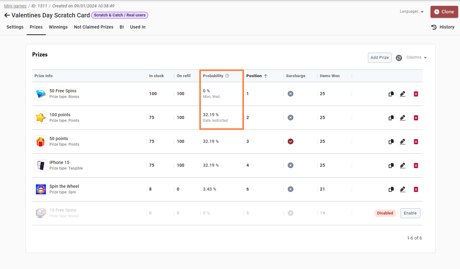 When configuring the game template, the operator should define how many items would be available for each prize. Based on this availability, the system will calculate the probability of winning each prize.