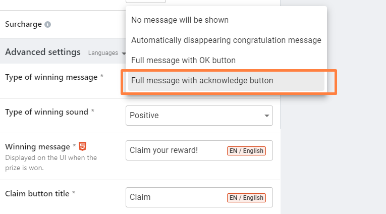 * Type of winning message - could be without a message, automatically disappearing message or message waiting for the users' acknowledgment (with "OK" button)