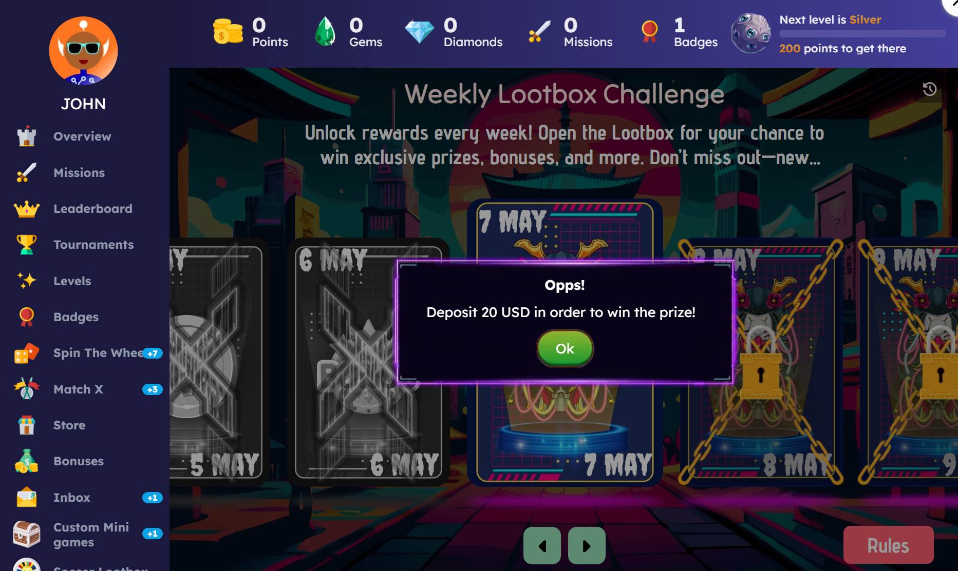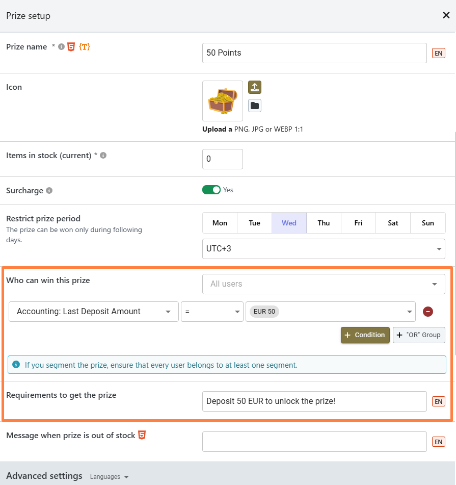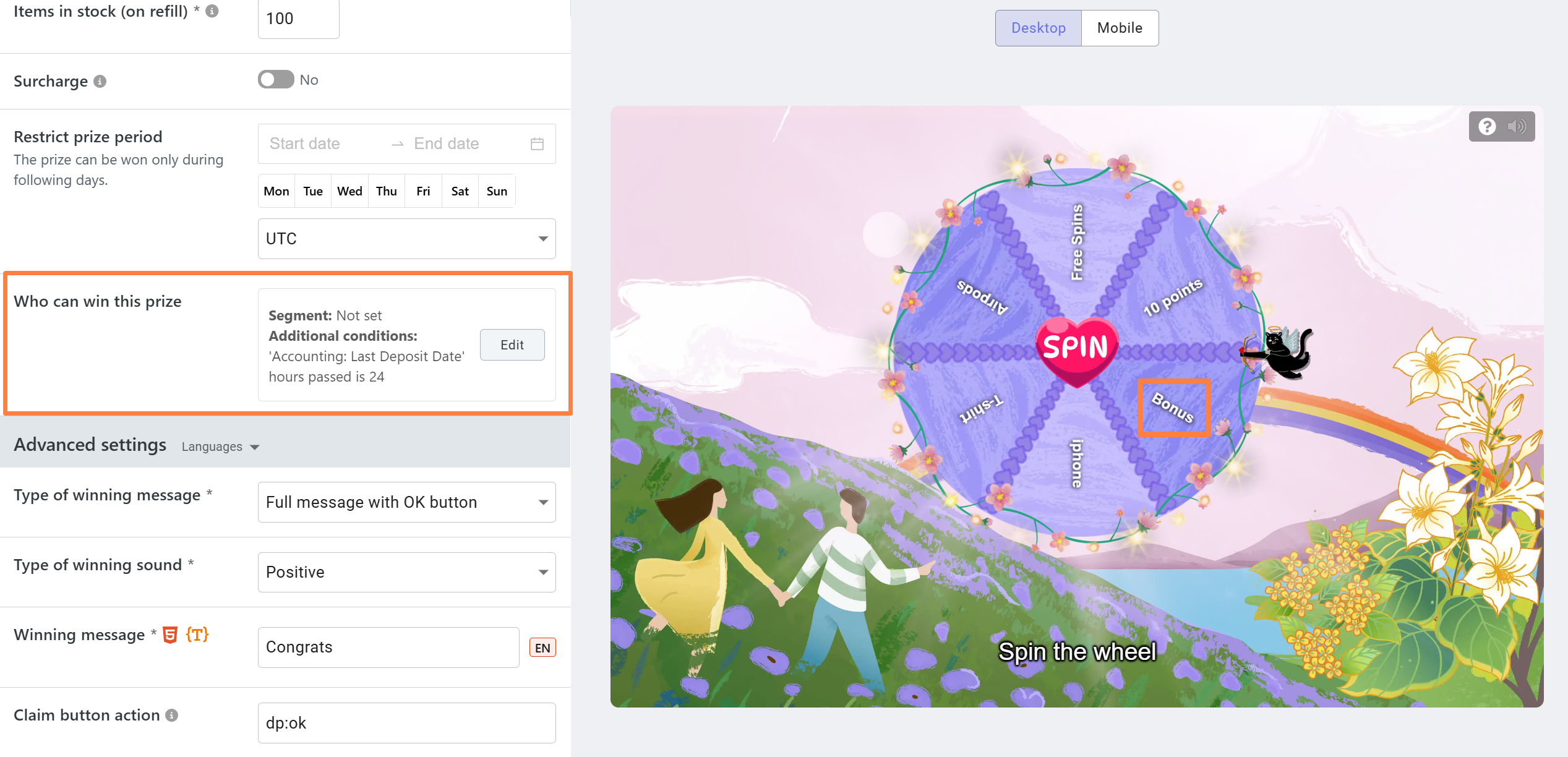 For example, in Spin the Wheel, you can make a prize eligible only for users who have deposited in the last 24 hours. Users who don’t meet this condition will still see the prize but won’t have a chance to win it.