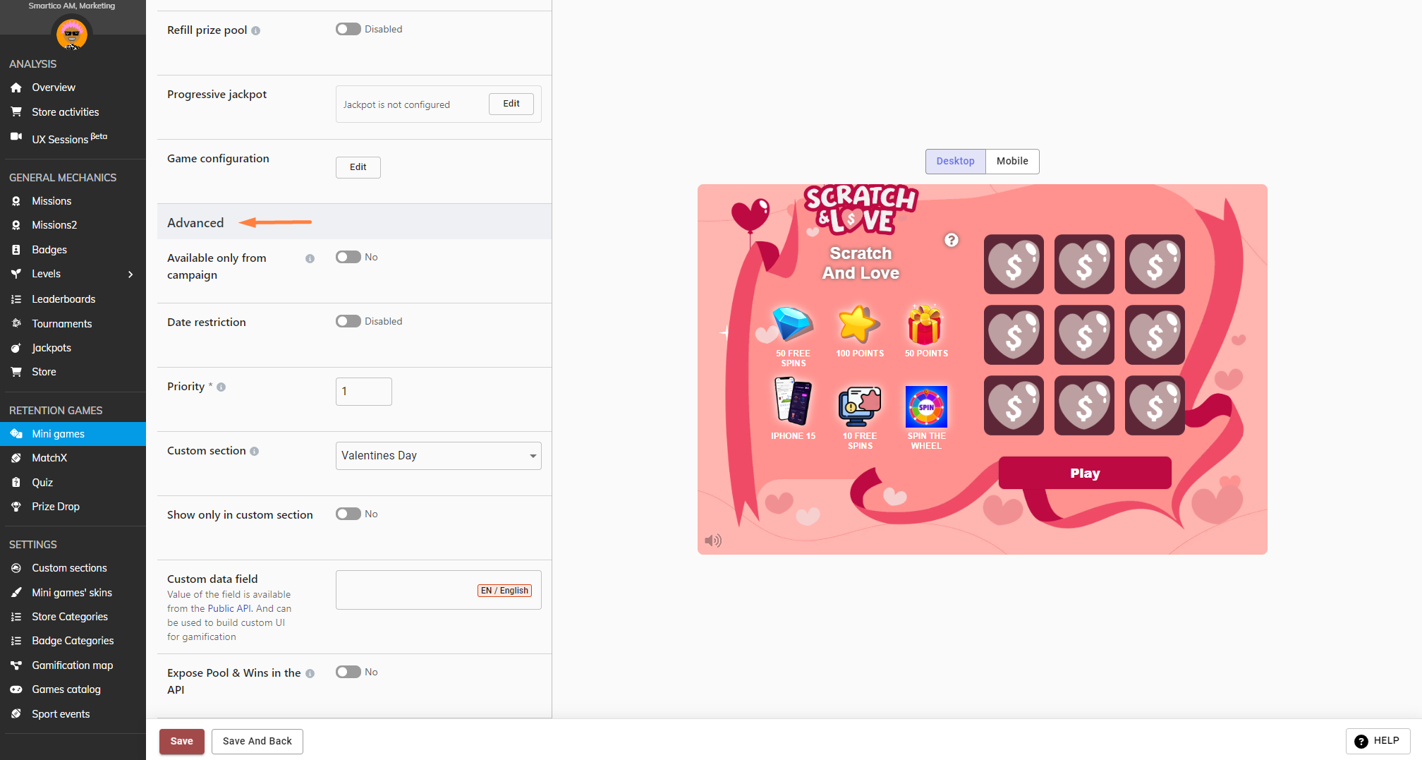 \- Advanced Settings -> Available only from a campaign, Date restriction, Priority, Custom Section, Custom Date field, Expose pool & win in the API.\