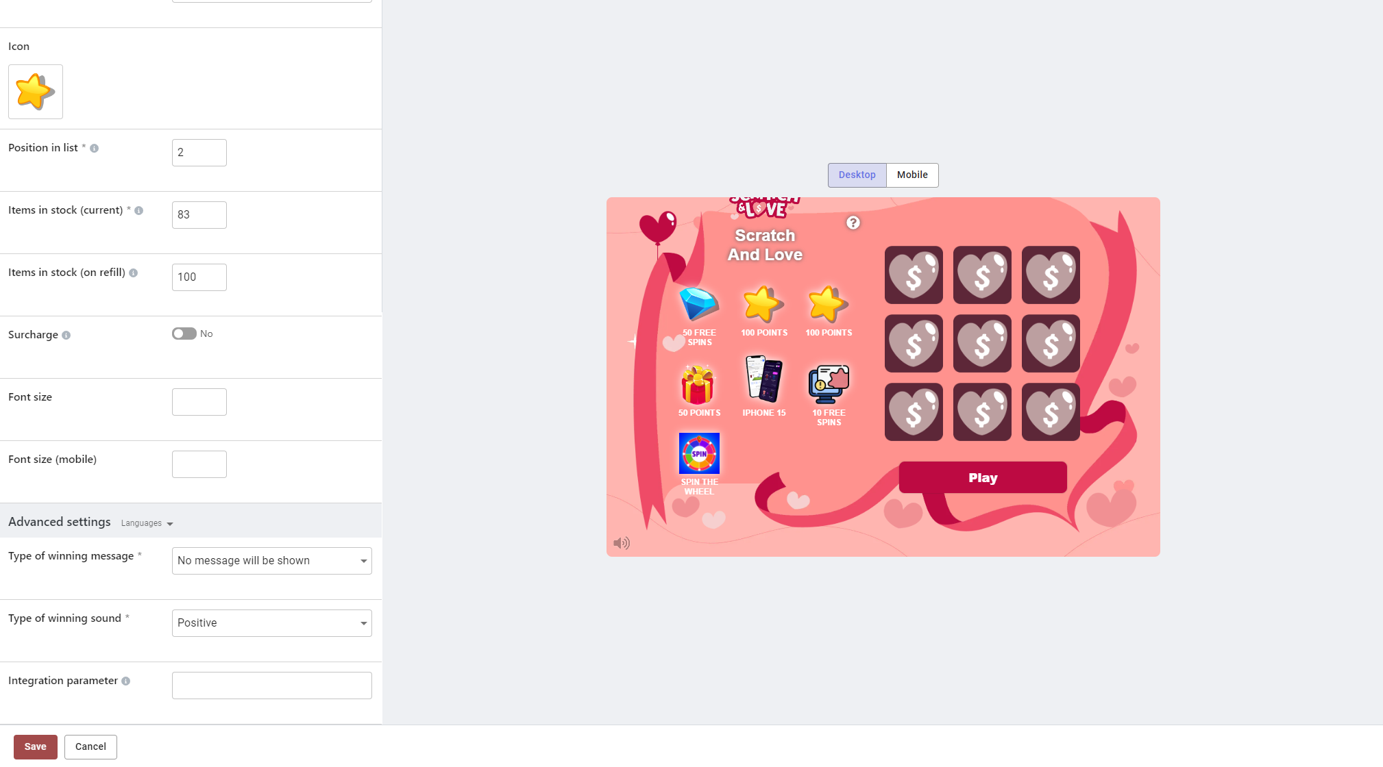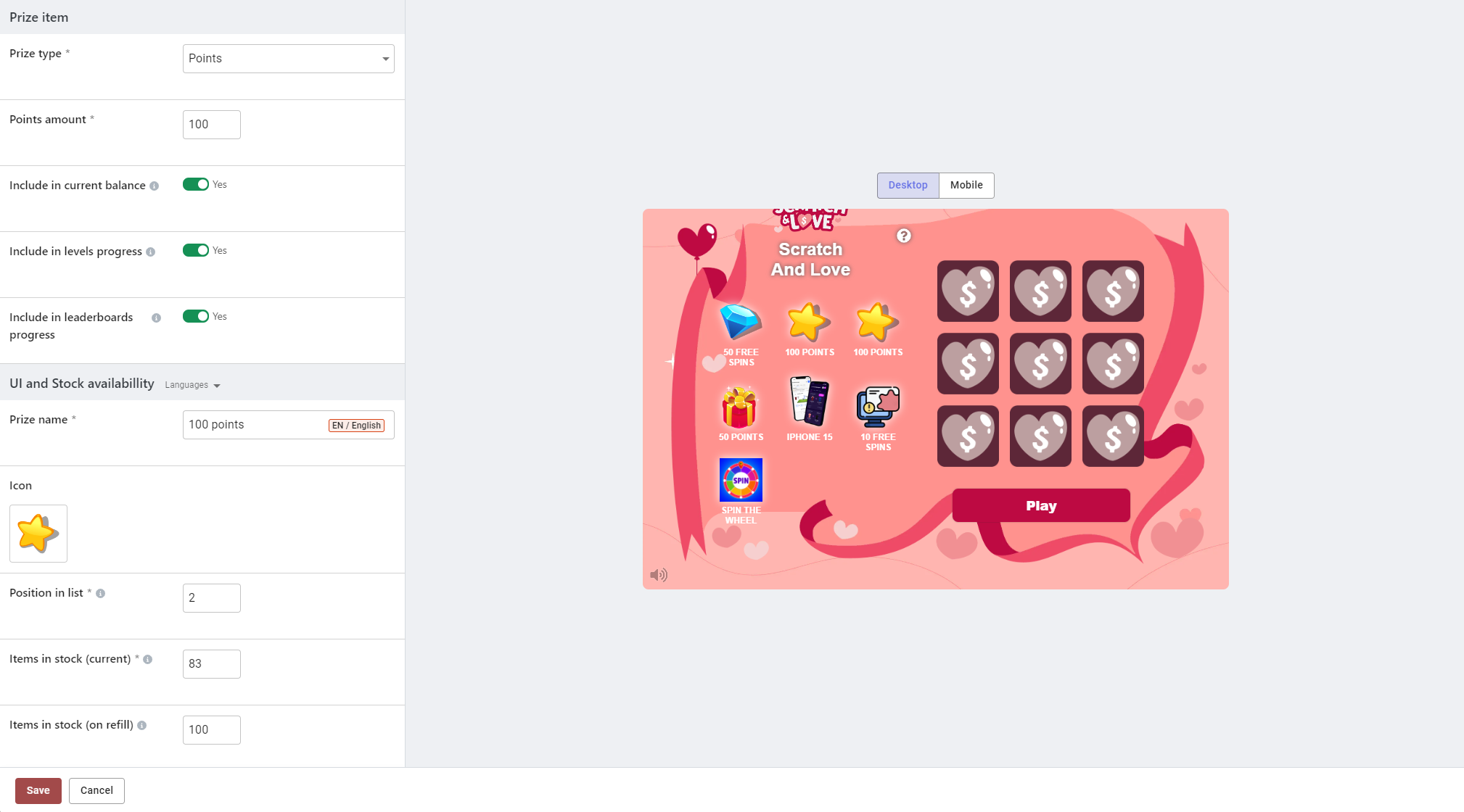 * Items in Stock (current) - Number of available items for this prize. When exhausted, the prize will be still visible in the mini-game, but cannot be won (0% probability)