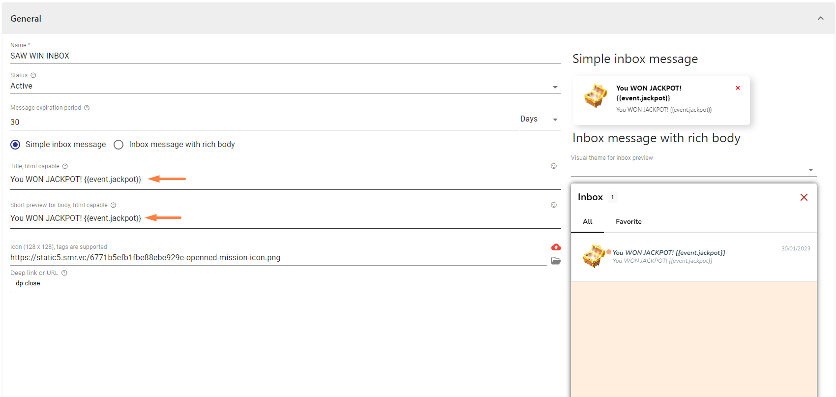 For sending communication that contains the amount of the Jackpot you should use **{{event.jackpot}}** tag. For example, you can set up an operational campaign that sends inbox messages to the players when they win the Jackpot. In the Inbox template, you should use the **{{event.jackpot}}** tag to display the jackpot amount.