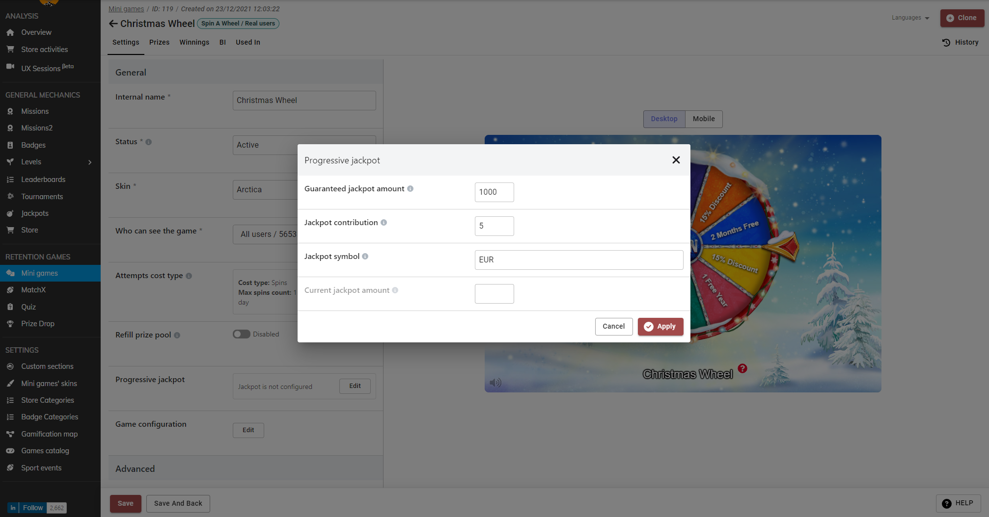 In this screen the operator can define the name and description of a mini-game, the number of sectors (for the Loyalty Wheel game) and upload a custom thumbnail that will be used as an iconic presentation of the mini-game in the list of all games as well as custom background and background music for the mini-game.