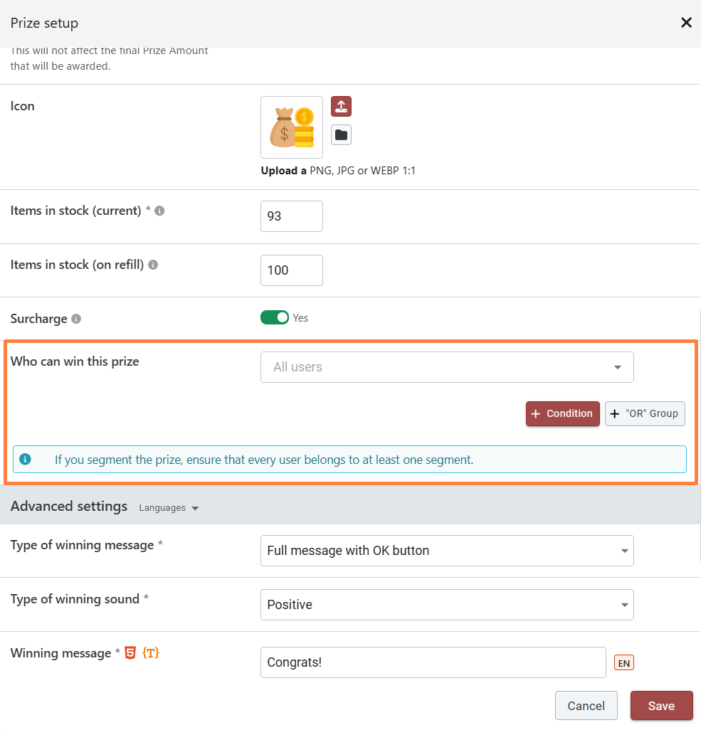 * When segmenting a prize, make sure that at least one prize is available for all users; otherwise, you risk having users who are not eligible for any prize. In such a case, we will display an error message in the game UI.