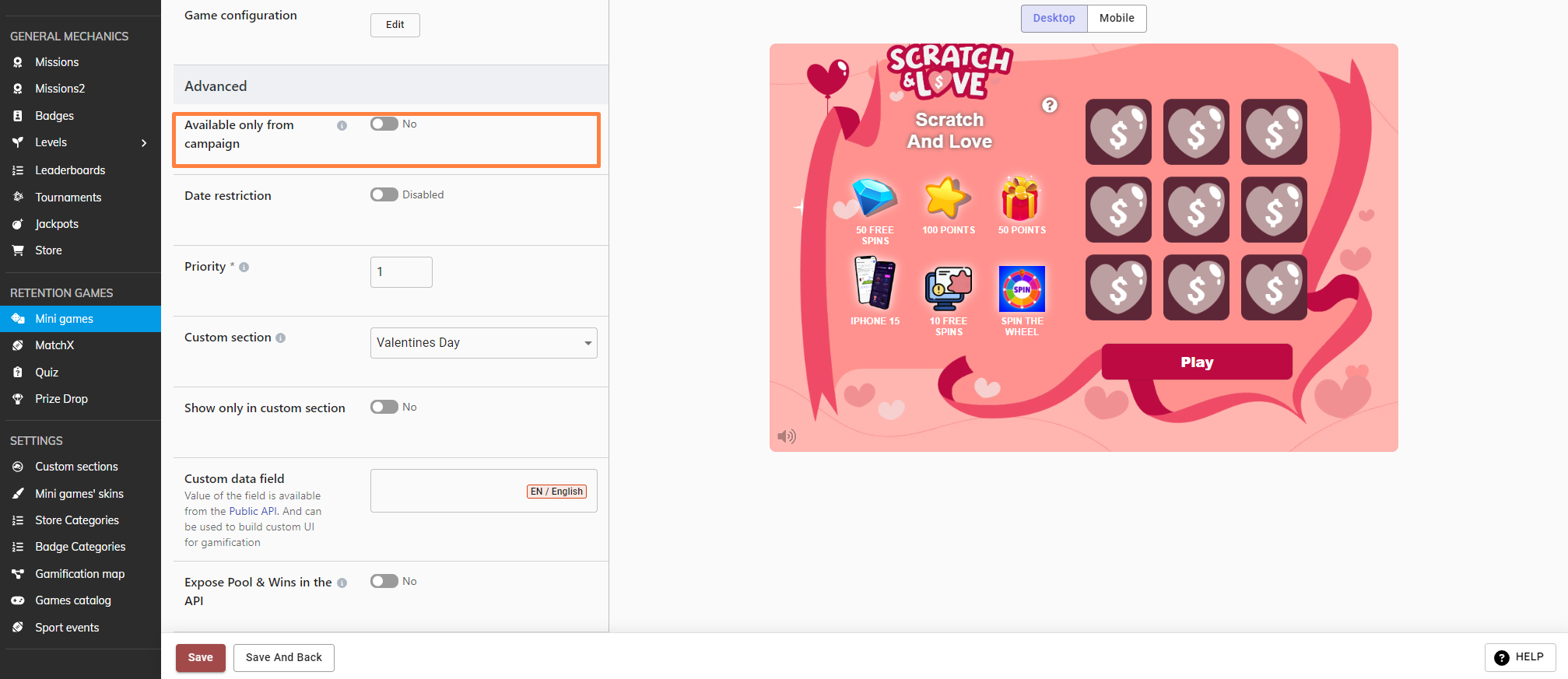 **"Available only from campaign"** - when the flag is set to "Yes", the game will be available only in standalone mode, even if the user is eligible for it according to the segment and has spins/points to play it. This configuration can be used to hide from Gamification screen game templates that will be given as Standalone games.
