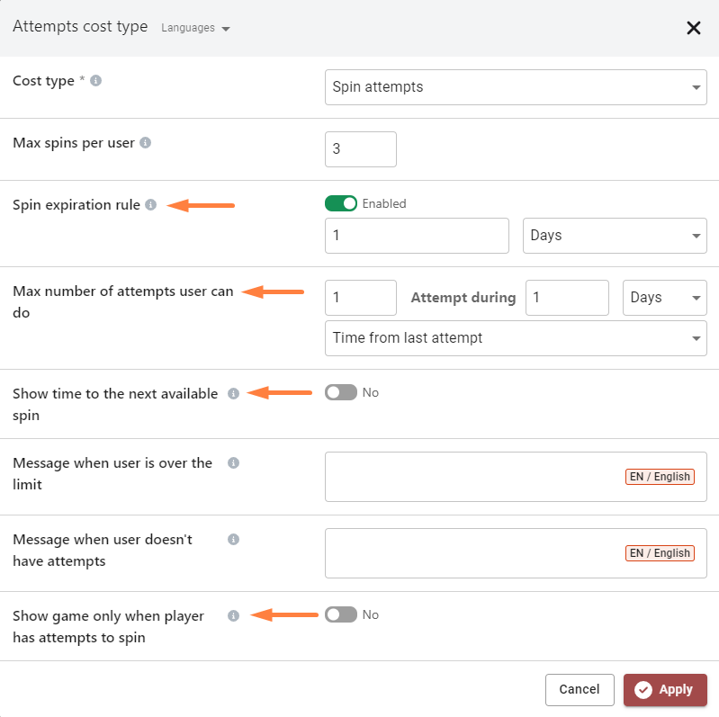 * Attempt price (e.g. Free of charge, gamification points, spins attempts)