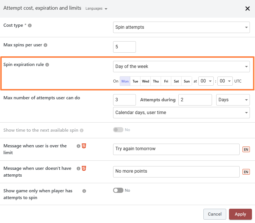 You can define a specific schedule for the spin expiration settings in mini-games and choose when the attempt will expire. Here are the available options: