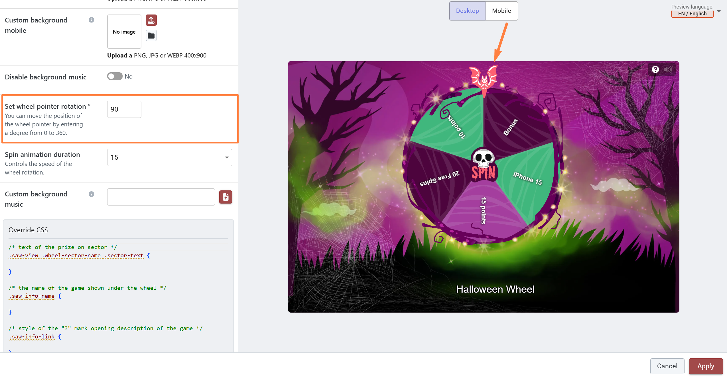 You can adjust the position of the pointer on the Spin the Wheel mini-game. This option is available in the BO under the Spin the Wheel template in the Game UI Configuration screen. By default, the pointer stays in its original position, but you have the flexibility to move it anywhere around the wheel—for example, to the top, left, or bottom. Enter the desired degree value, and the pointer will rotate counterclockwise accordingly.