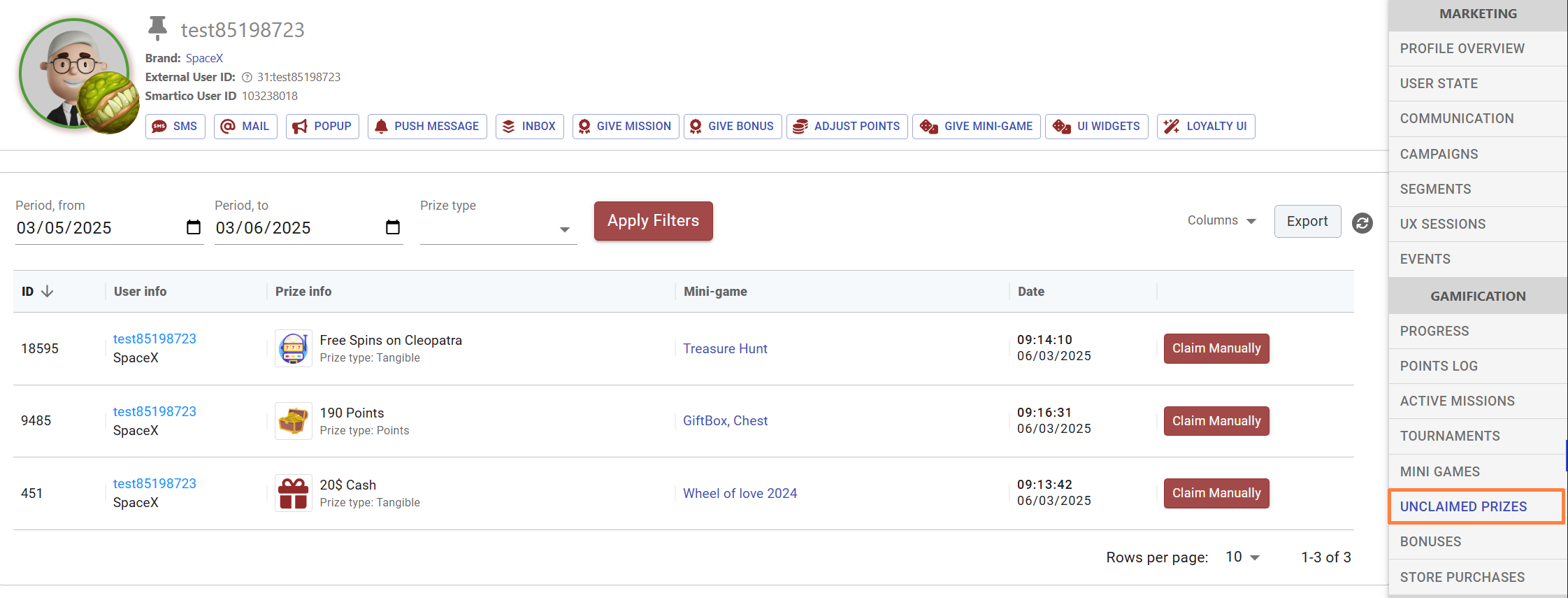 * When the user is not in the segment and has not met the conditions on the current date, the prize will be marked as missed.