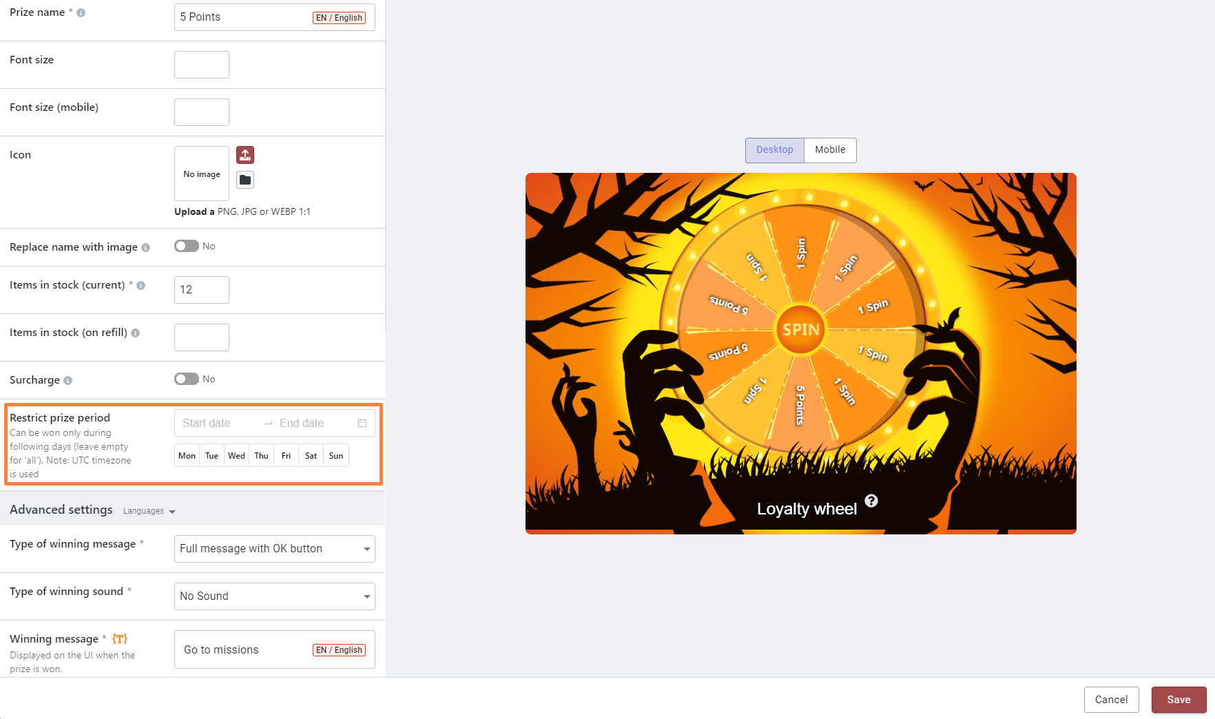 You can restrict the issuing of a prize by weekdays and/or date range. The option is available for all 3 random mini-games (Loyalty Wheel, Scratch Card, and Giftbox) and the Prize Drop and it is located in the Prize configuration screen. When a prize is restricted to specific dates or weekdays, it can only be won during that designated period.