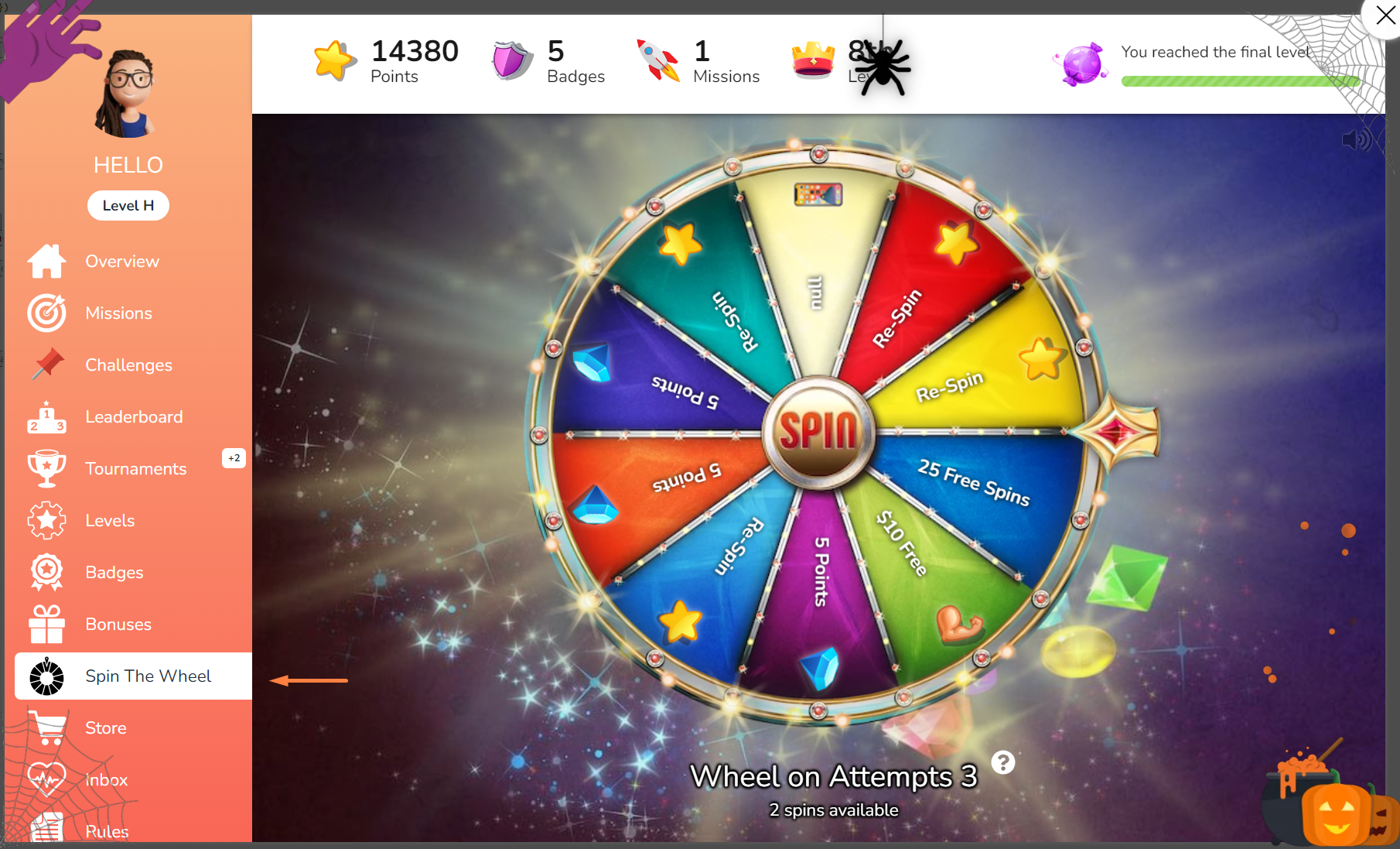 If there is just 1 mini-game configured, it will be directly opened when the user clicks on the Mini-game section from the left menu. The user can also see the cost of playing in a specific mini-game as shown in the screenshot below where the game in focus has 2 spins available for the current user.