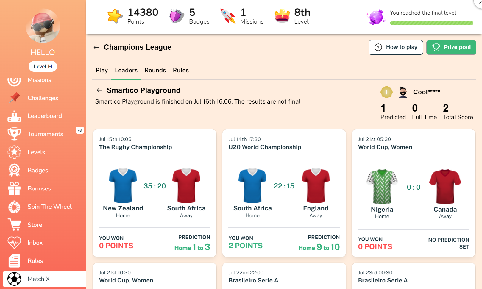 Please note that the score can change in real time if a match settlement is changed. For example, a match ended 2:1, and a user predicted the correct score and gained 10 points, only then the operator changed the score of the match manually to 0:3, and the score will be adjusted for the user.