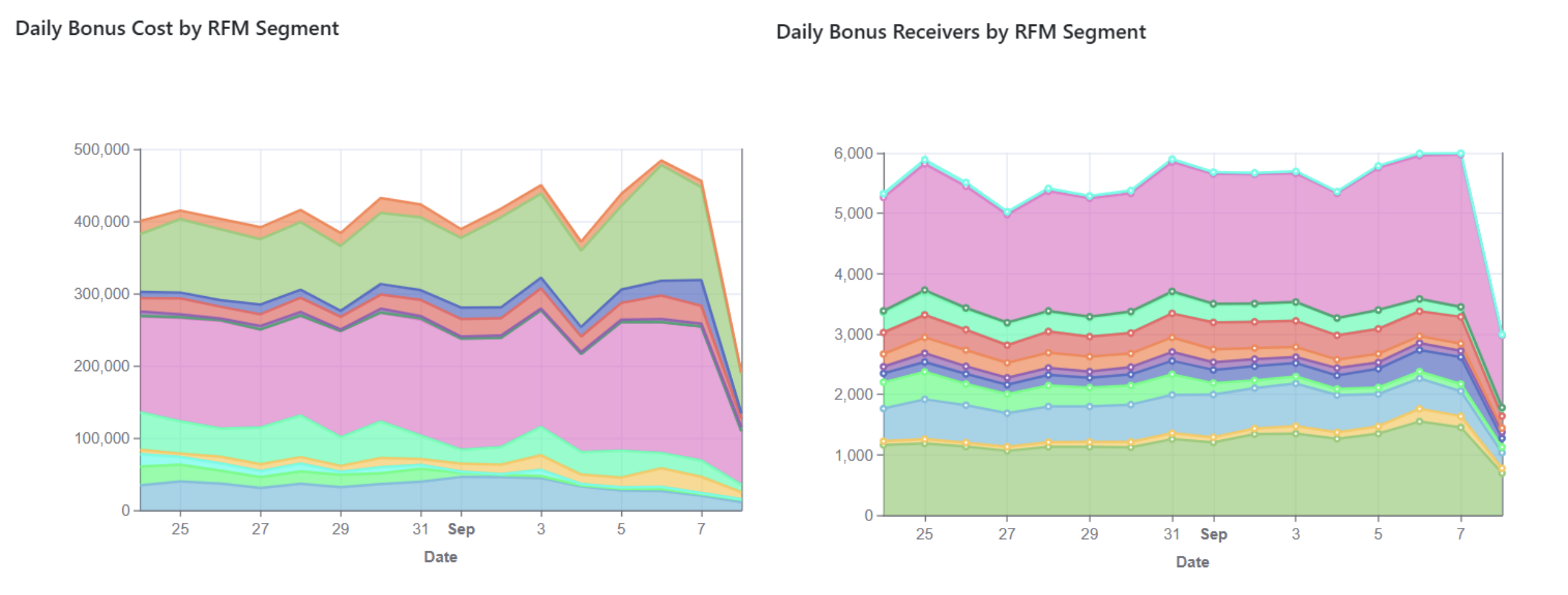 2. **Daily Bonus Cost by RFM Segments** – shows how bonus spending is distributed across player value segments on a daily basis.