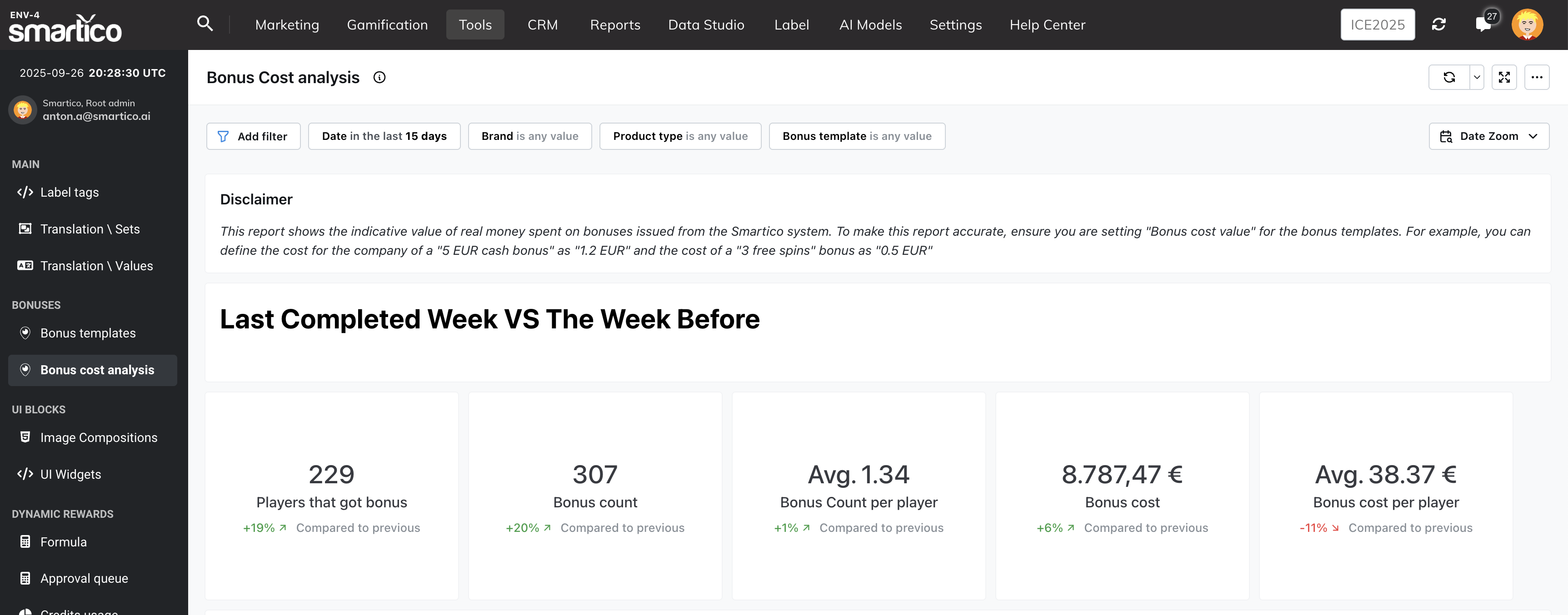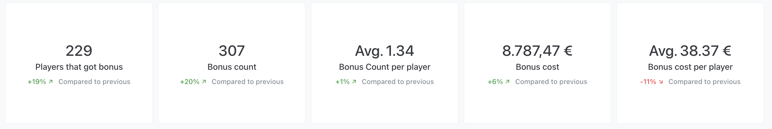 We’ve introduced a comparative view that highlights the week-over-week performance of your bonus activity. This section allows you to quickly identify trends and shifts in player engagement and bonus allocation.