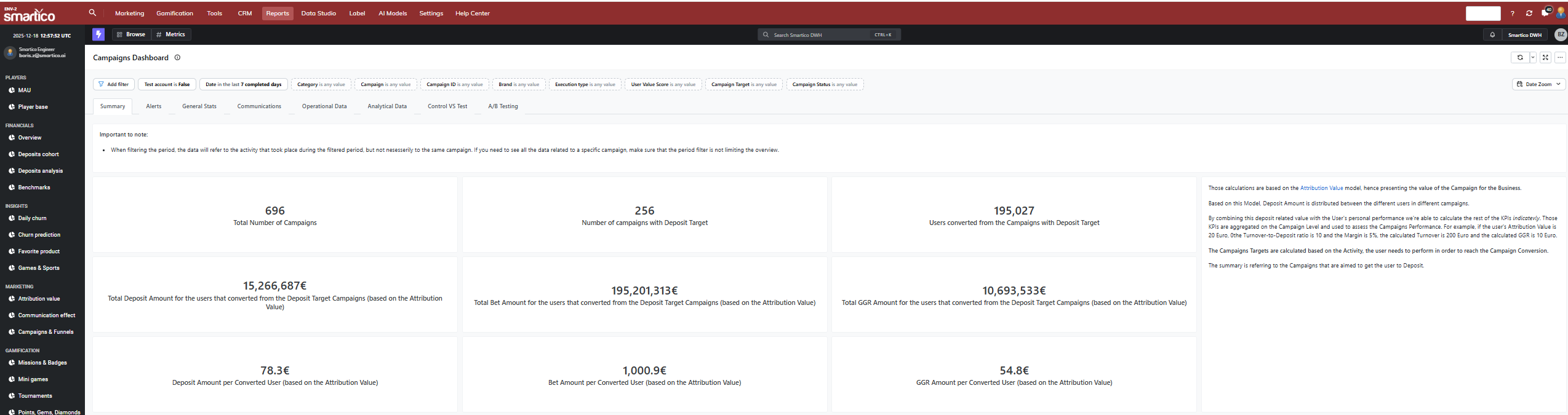 * Total Deposit Amount for the users that converted from the Deposit Target Campaigns (based on the Attribution Value) - the Deposit Amount, directly associated with the user's activity on the given Campaign. This calculation is based on the [Attribution Value](https://help.smartico.ai/welcome/products/general-concepts/attribution-value) model.