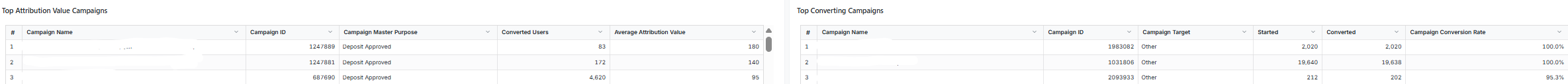 The Tables present the chart data in a less graphical manner with one table for the Top Attribution Value Campaigns and one table for the Top Converting Campaigns.