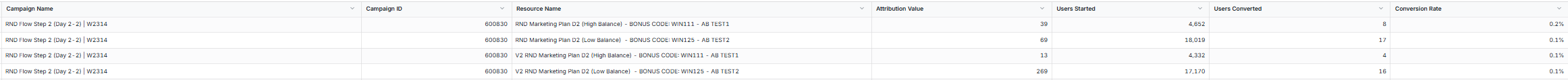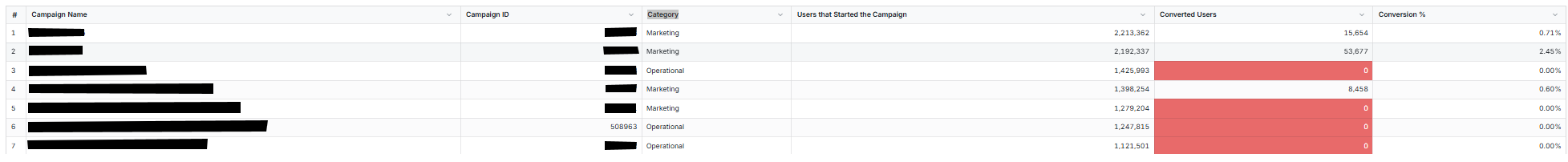 This table presents a list of the currently active Campaigns with at least 20 Users that had started the Campaign flow but their Conversion Rate is below 10%.
