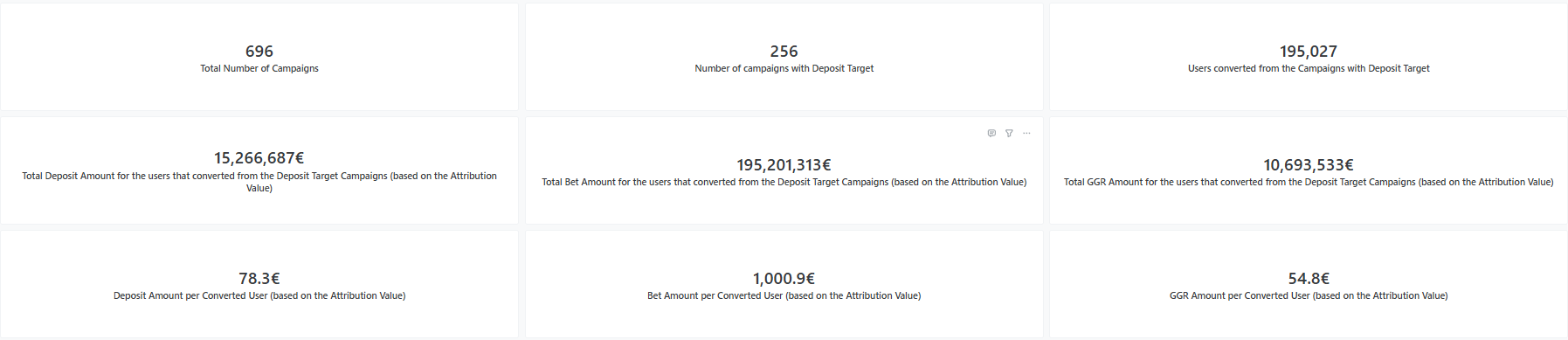* Total GGR Amount for the users that converted from the Deposit Target Campaigns (based on the Attribution Value) - the GGR Amount, associated with the user's activity on the given Campaign. This value is calculated by multiplying the already known Bet Amount by the user's personal margin during the last 30 days. This gives us an indicative value for how the user's bet amount will be translated into the revenue, based on the user's profile.