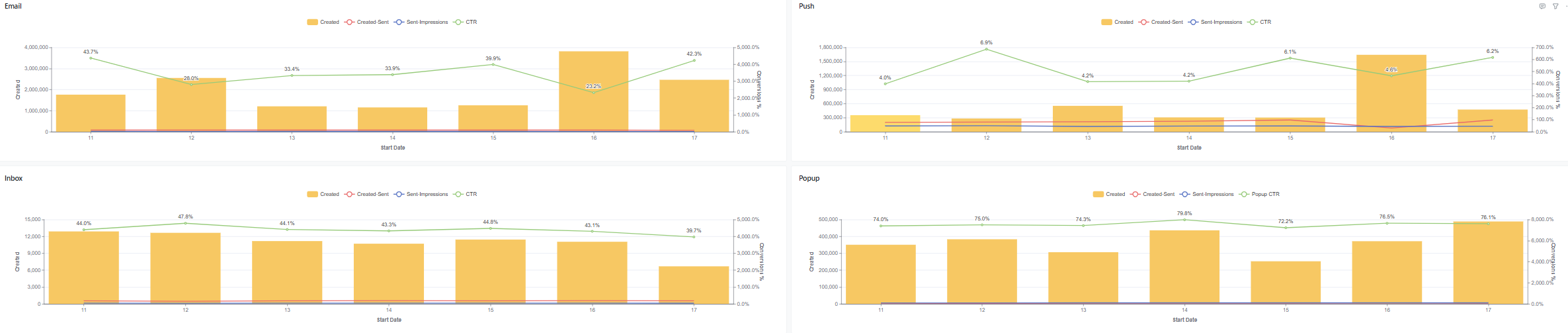 * Operational Reliability: By tracking the `Created-to-Sent` ratio, it instantly flags technical delivery failures.