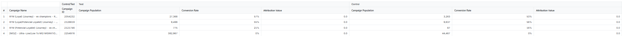 Use this tab to monitor the performance of the Campaigns, split into Control and Test populations. Based on this data decide whether the Campaign Test population outperformed the Campaign Control population.