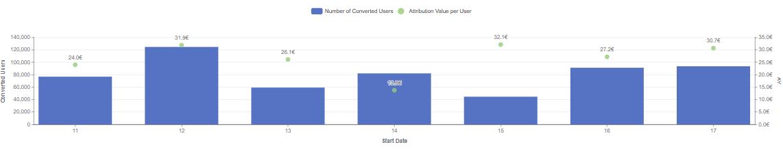 This chart introduces a daily number of users that were converted by the Campaigns as well as the average Attribution Value of those users.