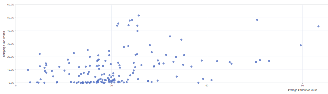 Use this tab to cross reference the Conversion Rate and the Attribution Value for the Campaigns. The Chart only refers to the Campaigns that have more than 20 converted users and an Attribution Value.