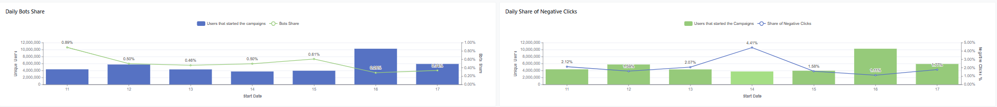 Use this section to monitor the share of the daily Bot Clicks and the Negative Clicks out of the created communications.