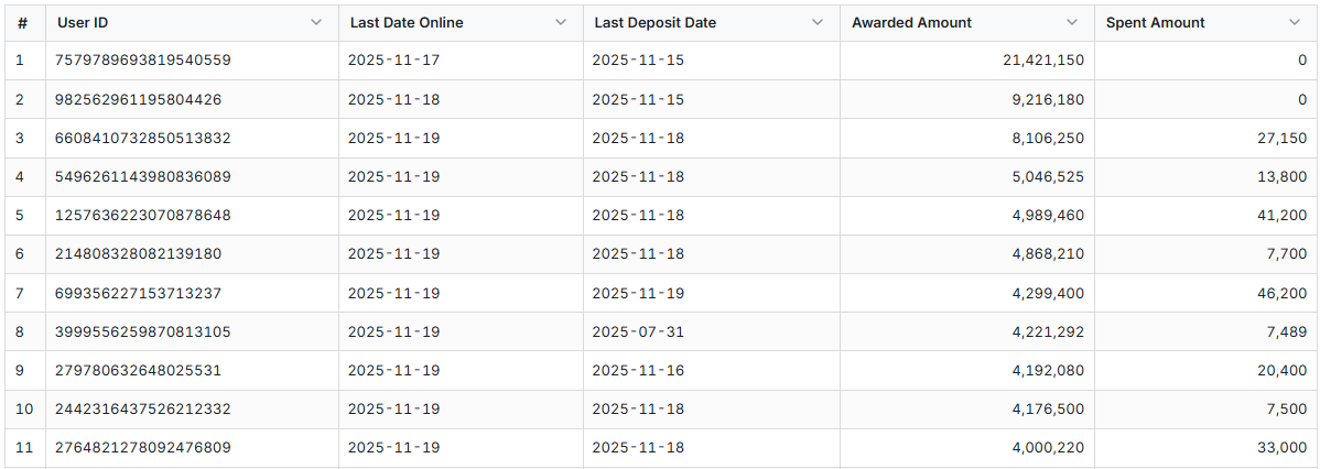 Value to You: This table provides crucial insight into reward efficiency by tracking the total Awarded Amount against the Spent Amount for your most heavily rewarded users.