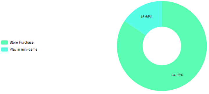 Pie chart, showing the total amount of all the types of Virtual Currencies that were spend by the users, split by sources of the Reward Type. For example, the Virtual Currencies can be used for an in-store purchase. The amounts from the different currency types are summarized as an absolute numbers, thus it's important to filter the specific currency type to see it's stats