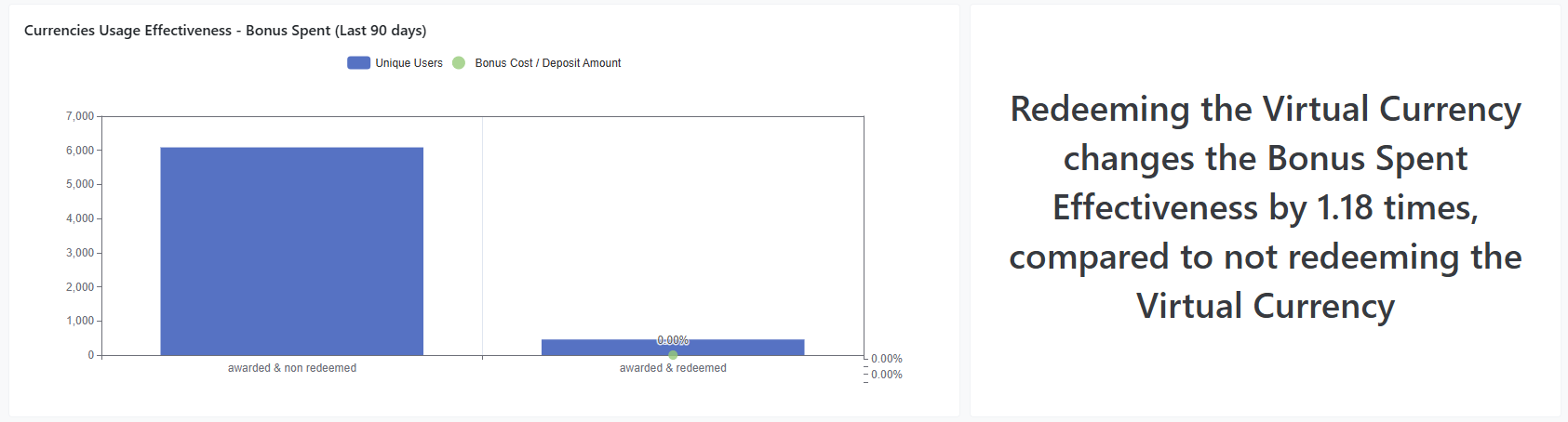 If the usage of the Virtual Currency is highly effective (changes Bonus Spent Behaviour by more than 1 time), it provides clear evidence to shift marketing budget from cash bonuses toward the lower-cost gamification system. Otherwise the usage of this feature needs to be optimized by offering the points redemption to the players as an alternative to the Bonuses granted by the Business.