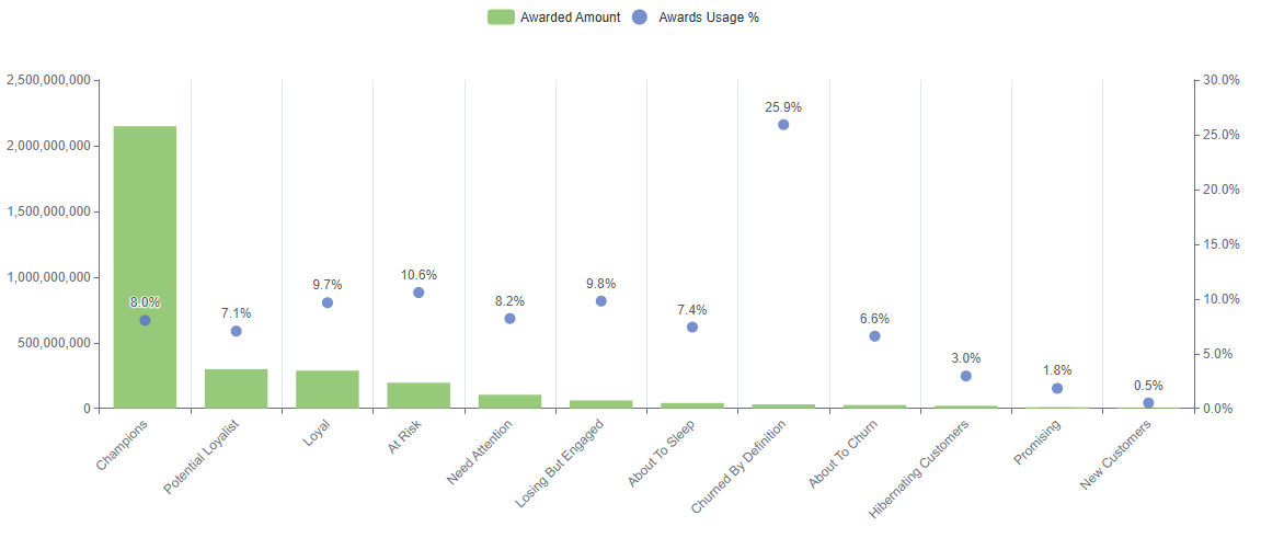 On the left side of Axis Y - Bar Charts, indicating the total Awarded Amount of the Virtual Currencies, split per users' current RFM Segmentation. On the right side of Axis Y - points, indicating the Rewards Amount usage as a share of the Rewarded Amount