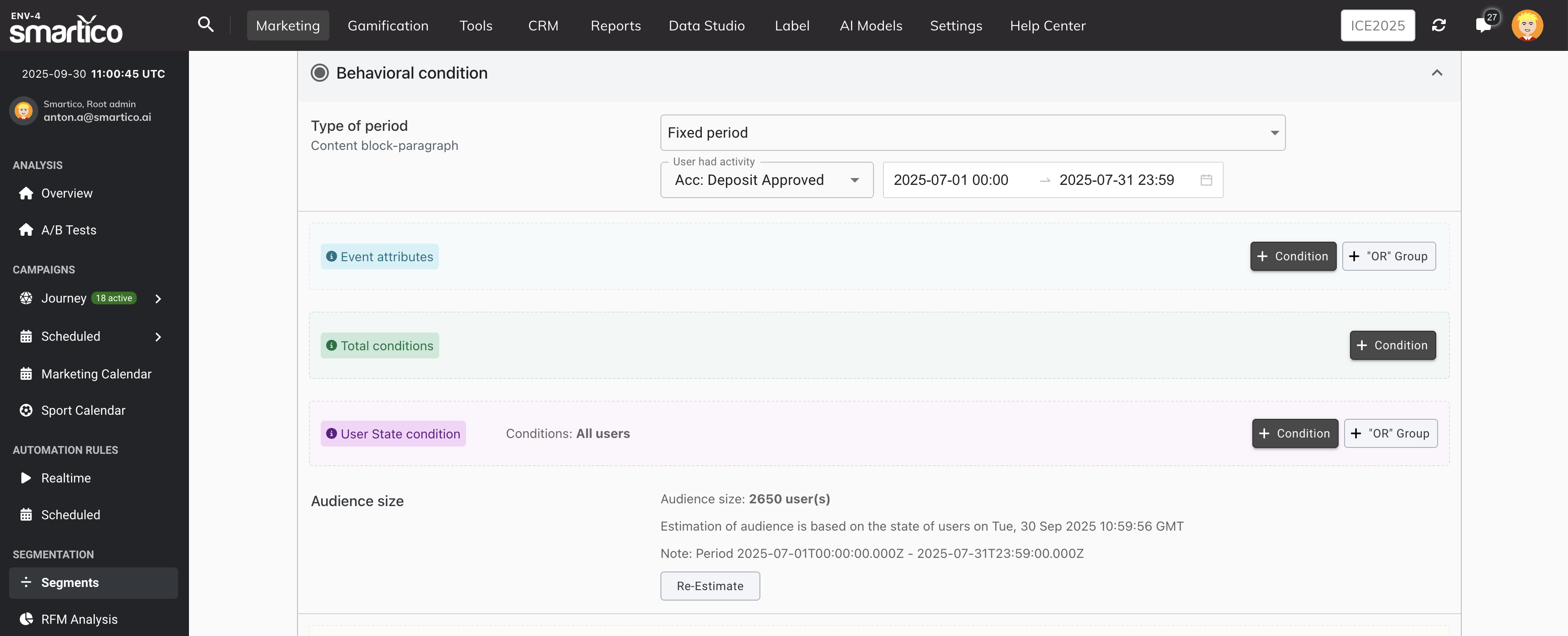 2. Create a behavioral segment, e.g. "Users who did deposits during July", validate number of users with your source