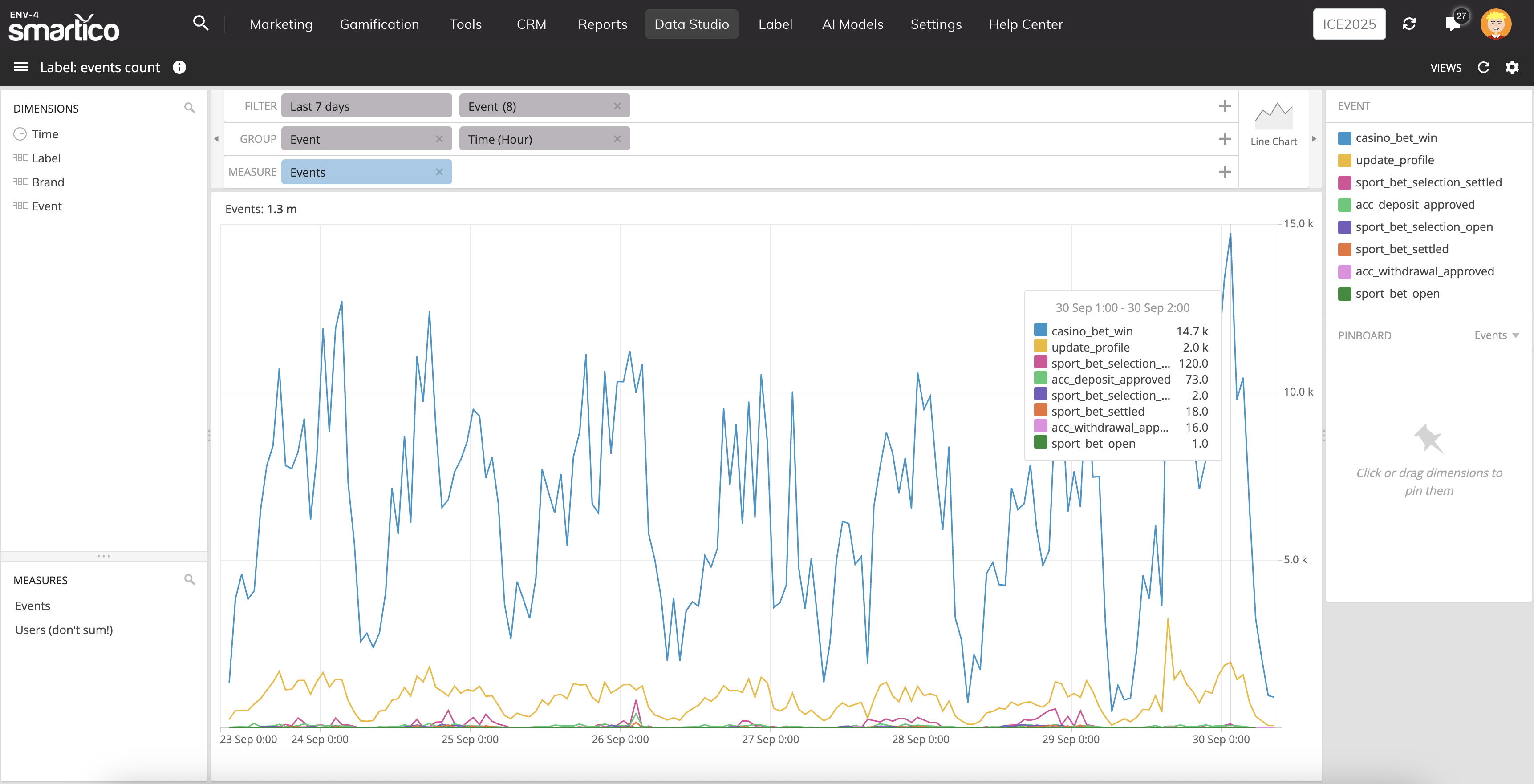In the **Data Studio \ Label: events** count you can monitor the volume of events and spikes