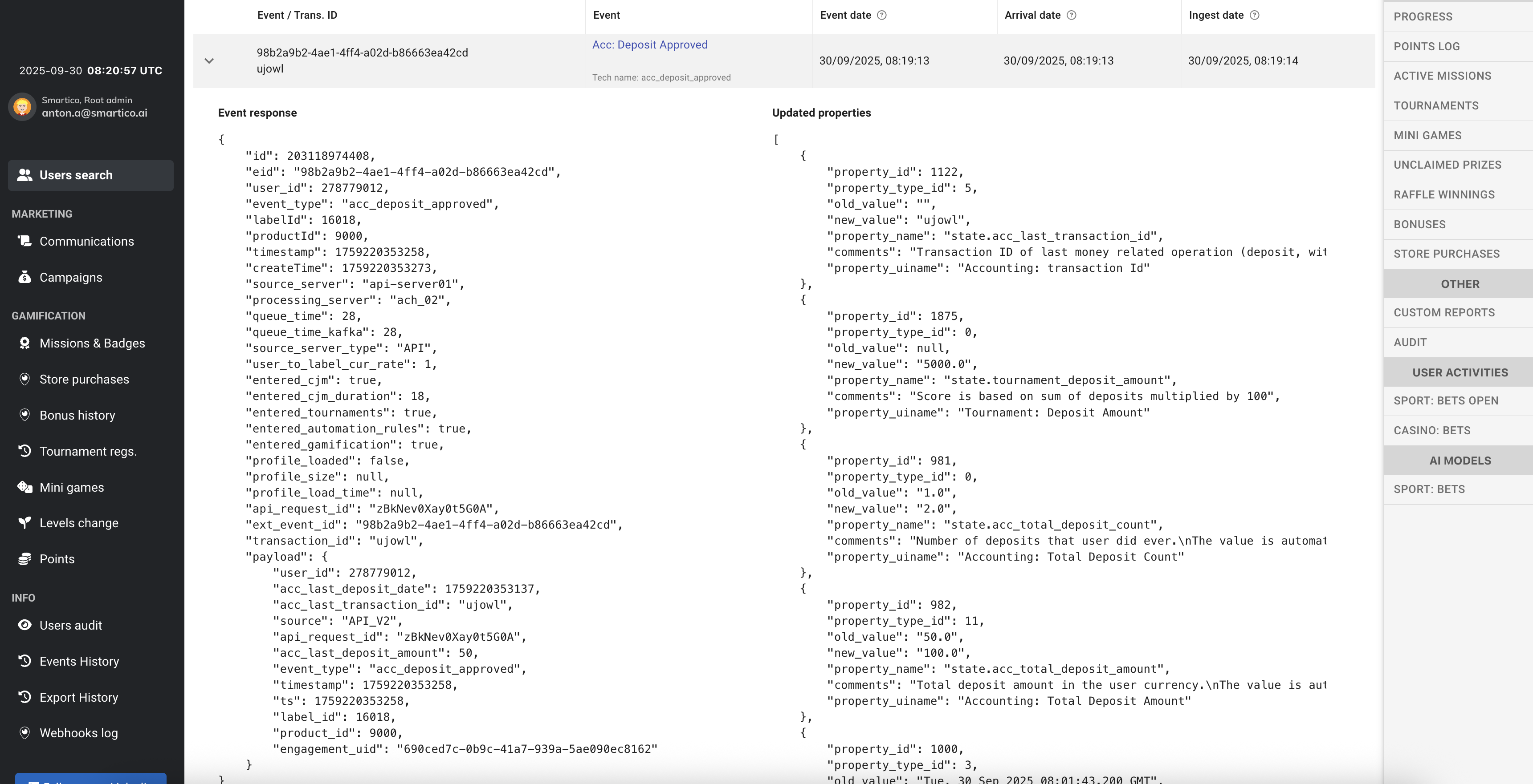 * **Right side:** Displays the properties that were updated in Smartico based on the event payload.