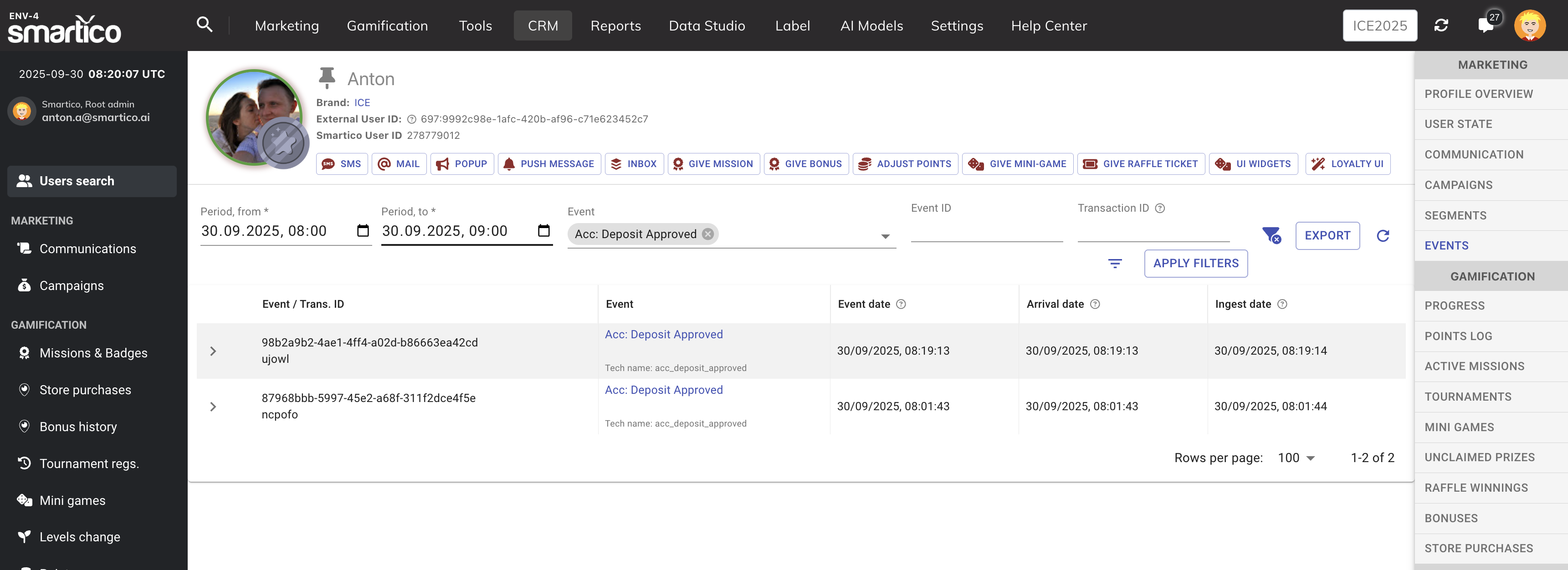 Navigate to the **CRM** tab and search for the user by their **User ext ID** (the identifier of the user in your platform).\