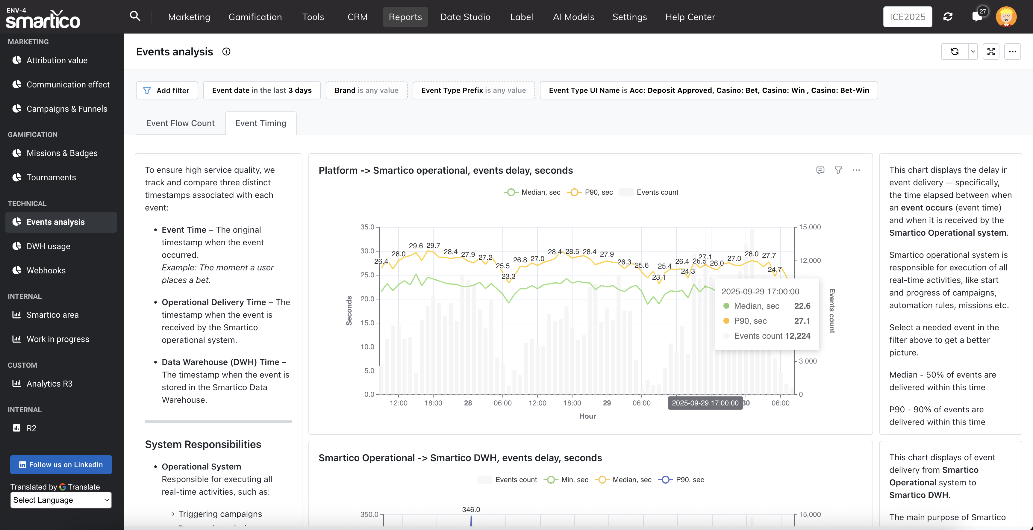 In the **Reports \ Technical \ Events analysis** you can monitor events delay (median and 90th percentile)