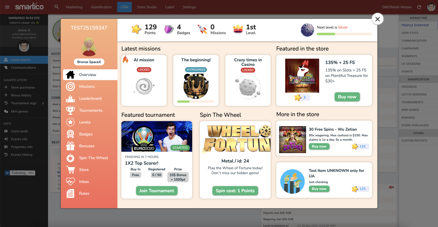 Smartico BackOffice is using the same approach to show the gamification widget of any user in the CRM section