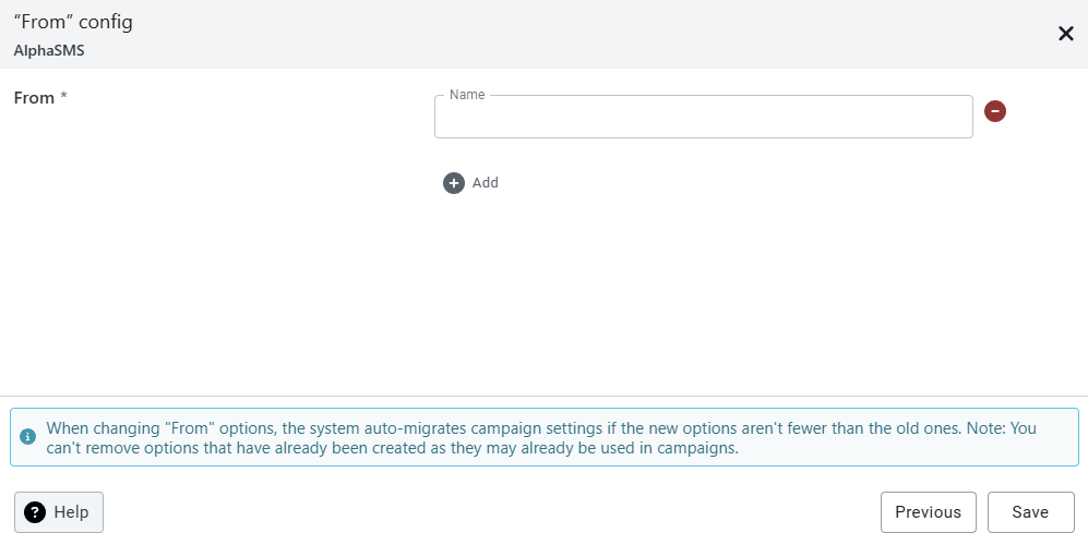 **The "From" config screen** (3rd page) - applies to SMS, WhatsApp and Viber only. It allows operators to define the “From” field - i.e., the sender name shown to users. This is a string representing the person or organization sending the message.