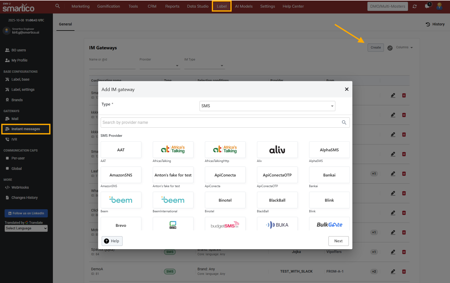 Smartico is communicating with IM providers to deliver offline communication to the end users. You can choose which IM providers to use and configure it in Smartico BO. The IM gateways can be configured from the Label tab -> Gateways section -> Instant Messages. If the provider is not on the list you can request it by contacting your Customer Success Manager.