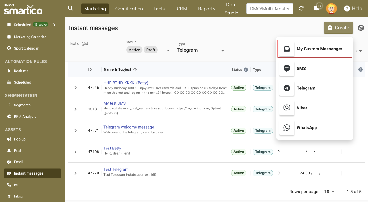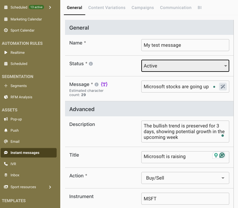 * Go to **"Marketing \ Instant Messages."**