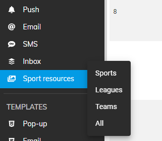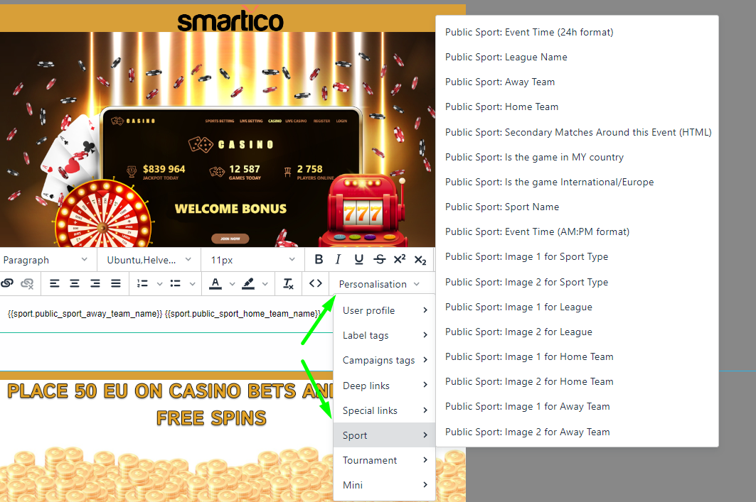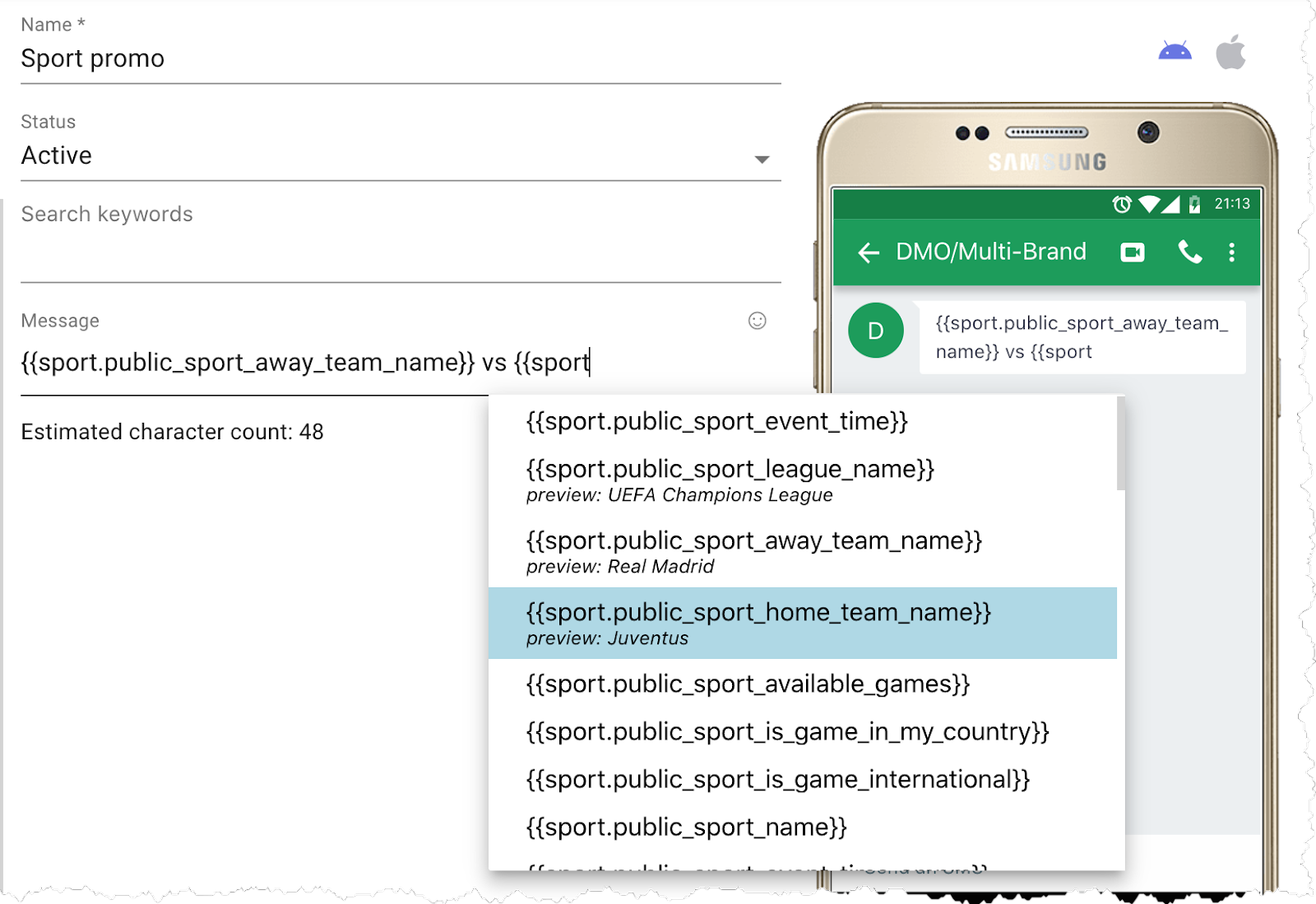 Every campaign targeting “sports events” provides the possibility to use tags related to the game, like league name, home and away team, etc. A list of available tags is available in the editors for all resources and can be visible when typing {{sport.