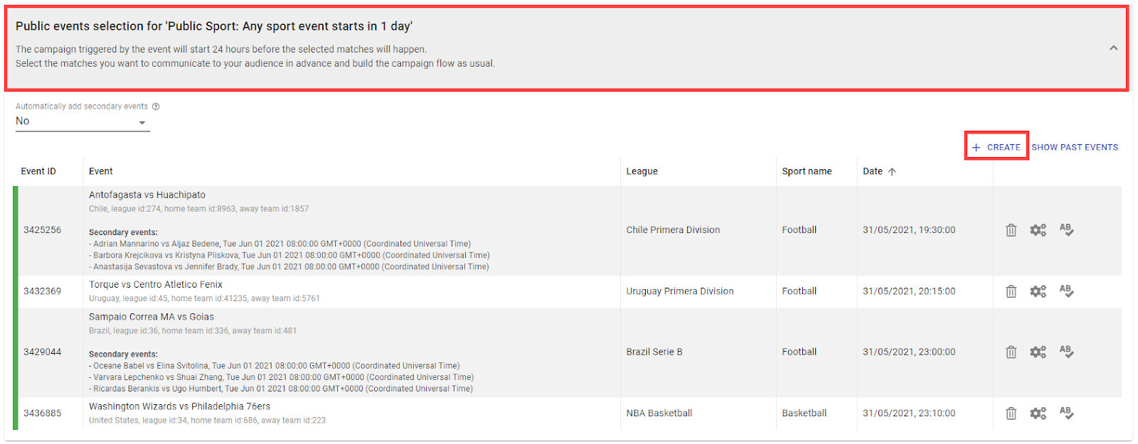 Click on the Create button to select games for the campaign, the information stored in these matches will be populated in your creative assets. The Secondary Events are the matches that will be presented in the table below the primary match that is triggering the campaign. To add Secondary Events click on the multi-select icon![](https://lh7-eu.googleusercontent.com/4HfTpE1TeU09QA3ytlR39UI1gJ03VsACFdXWhpuO4FuPfga4I8i8gl8xsImjJyG7BsDDF8pMztu1phMJ2PMbC4SakEIZxGX2BSqMrkh4ODi7huzR-mZHaBORx2iI3OTAHEs3hM0B0SqdN6fJO0WB_Q) and select more events to be shown in the table.