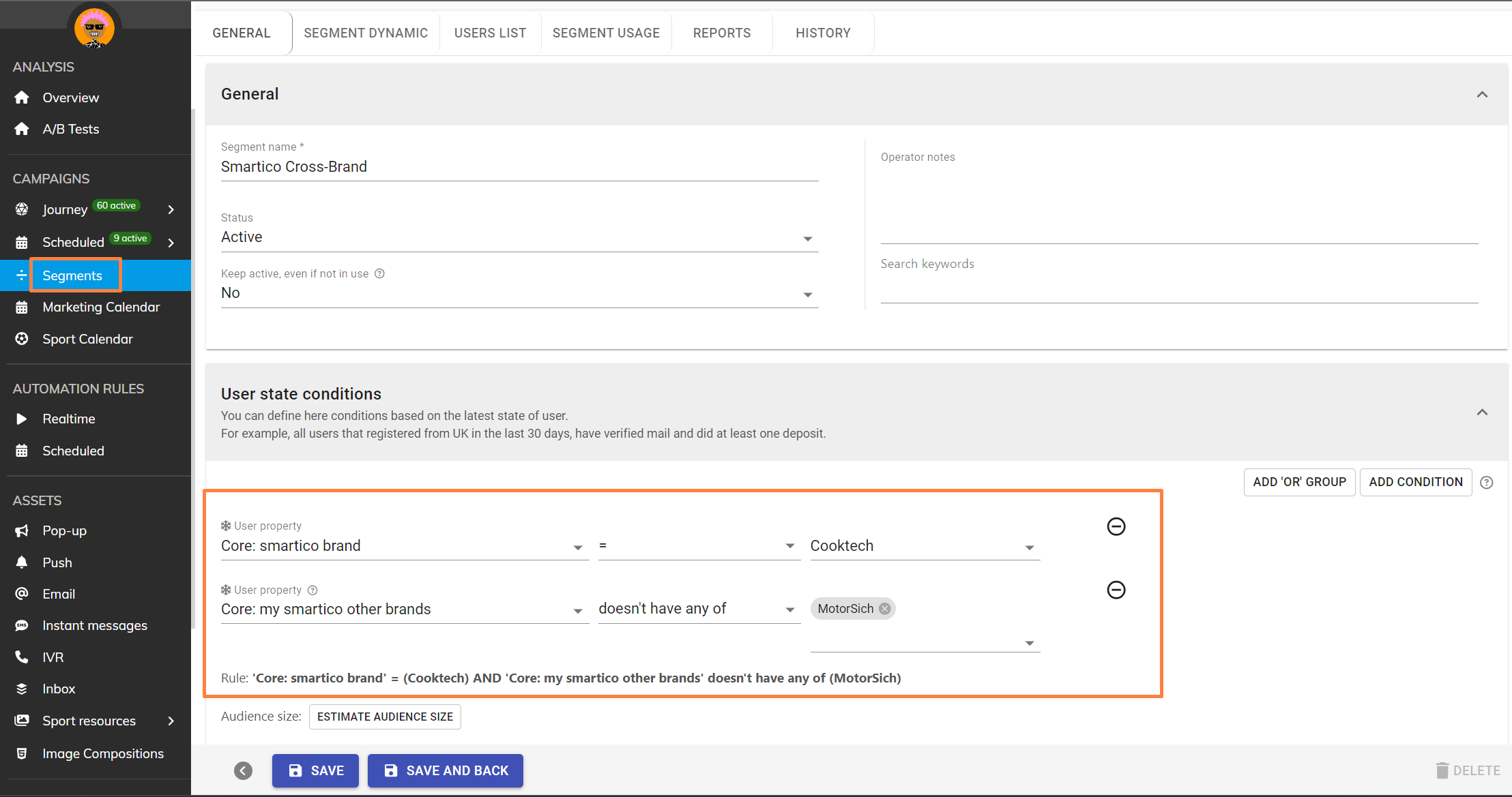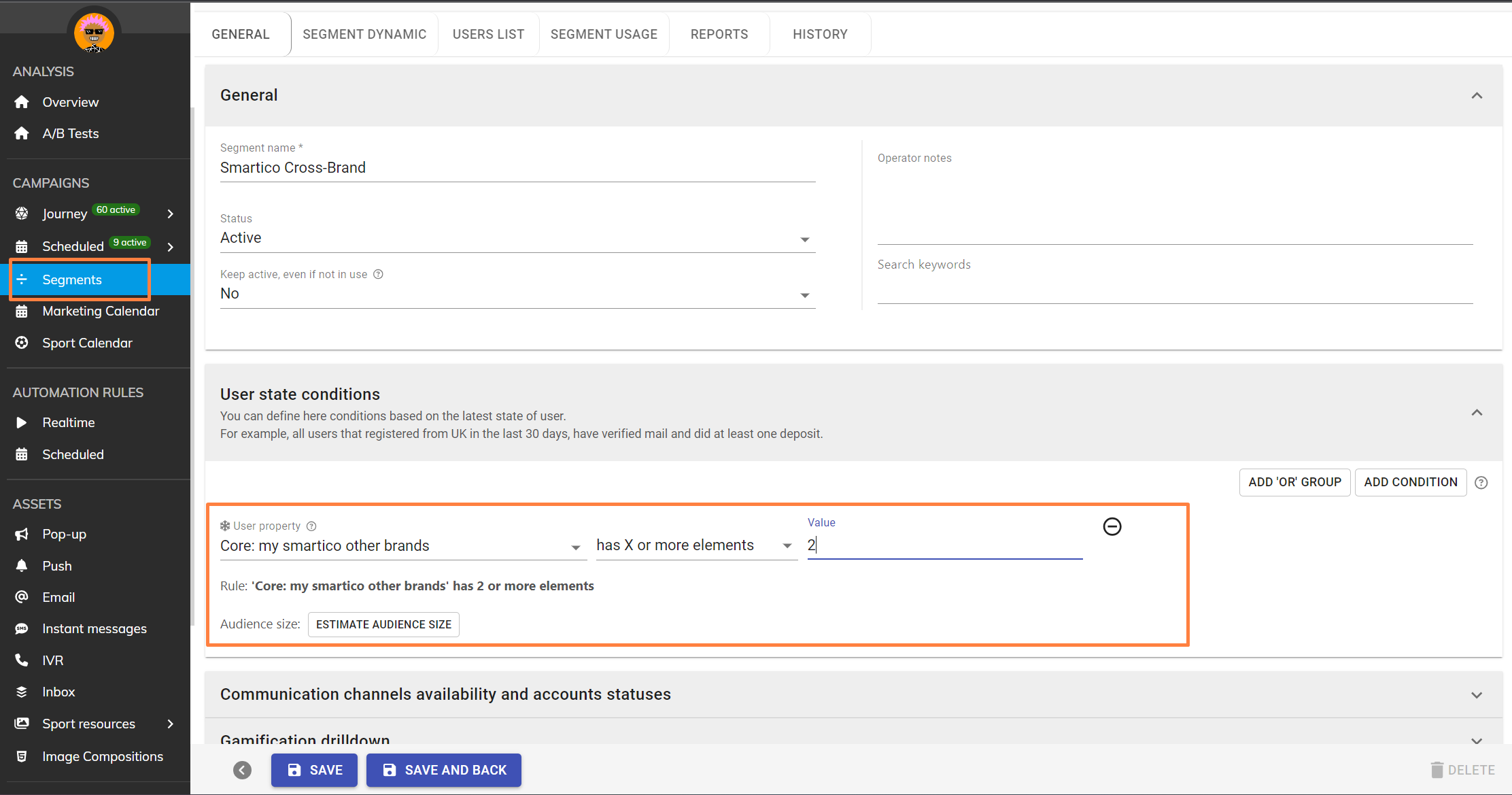 These properties allow you to identify players with multiple accounts across all your brands and then specifically target them from a different brand. For example, you can create a segment with users who possess an account on one of your specific brands but lack an account on another distinct brand of yours.